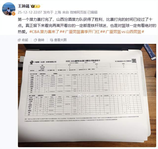 王珅葳:“第一个潜力赛打完了,山西汾酒潜力队获得了胜利,比赛打完的时间已经过了十点。真正留下来看完再离开看台的一定都是铁杆球迷,也是对篮球一定有着绝对的热爱。”