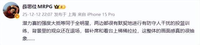 薛思佳:“潜力赛的强度大抵等同于全明星,两边都很有默契地进行有防守人干扰的投篮训练,背景里的观众还在退场,替补席和看台上稀稀拉拉,这整体的画面感真的很抽象……”