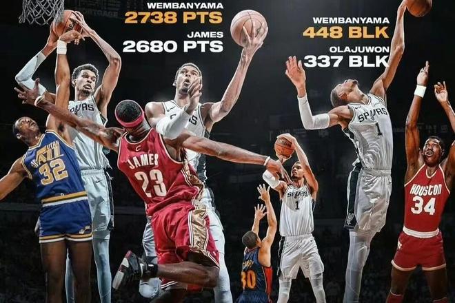 而文班亚马目前已经打完了个人职业生涯前120场比赛,前120场的总得分2738分,超过了詹姆斯的2680分;总三分命中数274记,超过了库里的242记;总封盖数448次,超过了奥拉朱旺的337次;总篮板数1301个,超过了马龙得分1091个。