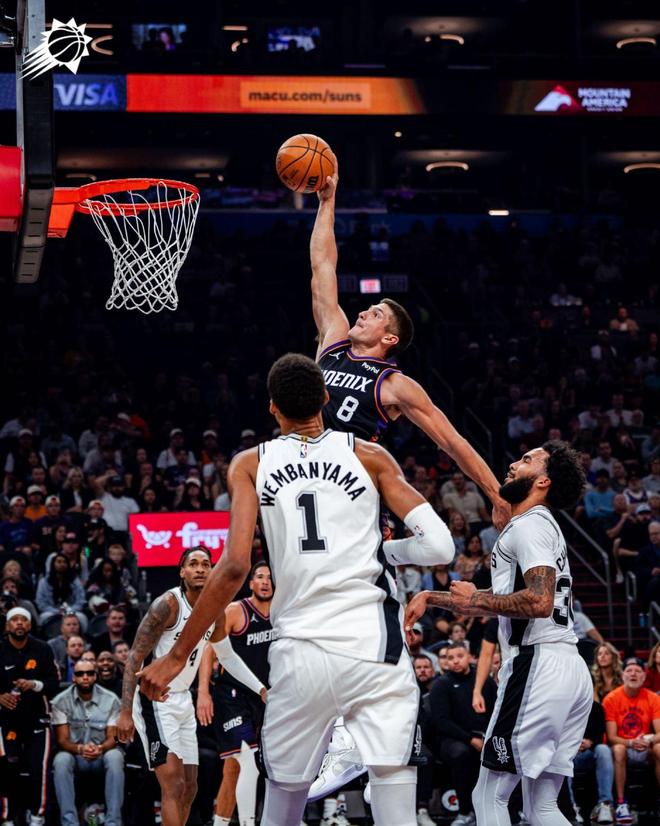 布克进攻犯规,凯尔登约翰逊单臂隔扣马克威廉姆斯。凯尔登约翰逊2罚全中,文班亚马外线取分,马刺打出了12比0的进攻狂潮。太阳请求暂停,布克连续单打卡斯尔,卡斯尔接连出现3次犯规,布克2罚全中,邓恩命中远投,菲尼克斯稳住局面。文班亚马中投打铁,凯尔登约翰逊外线不进,布克单打得手,太阳打出了7比0的攻势,分差来到了21分。距离终场仅剩4分32秒,圣安东尼奥请求暂停并换上板凳席末端的球员,选择提前弃子认负。两队开始在场上练兵,比赛就此失去了悬念。最终,太阳以130比118完胜马刺。