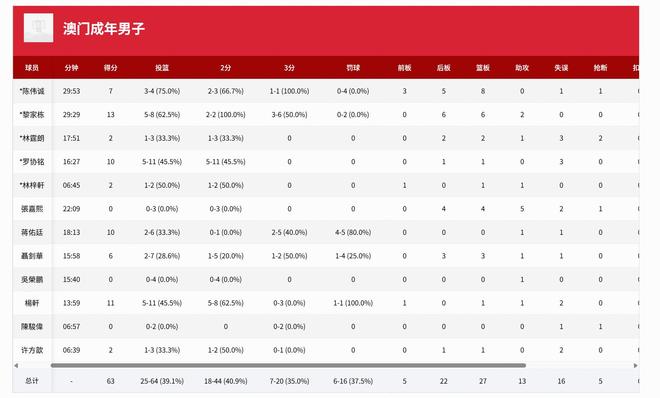 中国澳门男篮:黎家栋13分6板2助、杨轩11分1板1助、罗协铭10分1板、蒋佑廷10分1助、陈伟诚7分8板2断;