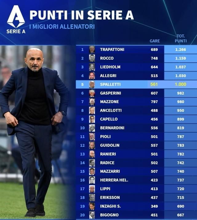 尤文0比0都灵,凭借这场平局,斯帕莱蒂拿到执教生涯意甲第1000分,成为特拉帕托尼、罗科、利德霍尔姆和阿莱格里之后,第5位在意甲中达到 1000 分里程碑的教练(胜场按3分计算,对手弃权算胜)。 在这561场意甲比赛中,斯帕莱蒂先后带领恩波利(34场37分)、桑普多利亚(28场34分)、威尼斯(17场15分)、乌迪内斯(117场178分)、罗马(211场422分)、国际米兰(76场141分)、那不勒斯(76场169分)和尤文图斯(2场4分),取得了289胜133平139负的战绩。