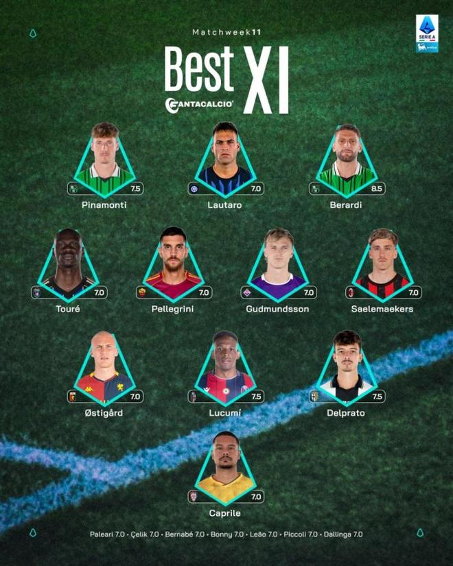 中场:伊德里萨·图雷(比萨)、佩莱格里尼(罗马)、阿尔伯特·古德蒙德森(佛罗伦萨)、萨勒马科尔斯(AC米兰)
