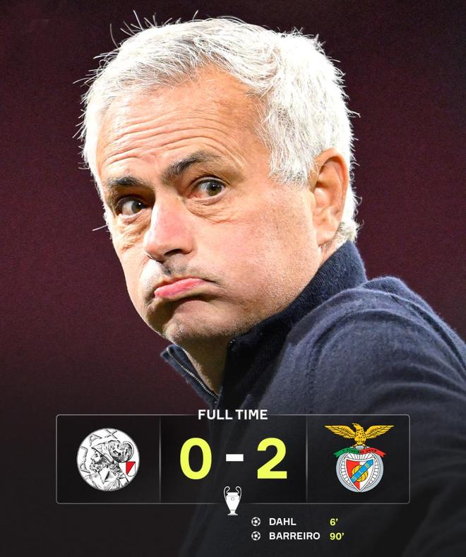 易边再战,一上来大巴士就横在那,本菲卡控球率长期不到40%,但反击效率极高。第71分钟德迪奇抽射险些破门,第77分钟格洛赫小角度轰门再次制造威胁;无路可退的阿贾克斯疯狂反扑,无奈“大巴车太大”啦,一次次无功而返,第90分钟,本菲卡利胜一次反击机会,由巴雷罗带球杀入禁区再下一城,2-0!彻底杀死了比赛。穆里尼奥振臂怒吼,替补席全员冲出场外庆祝,欧冠首场胜利就这样到手。反观阿贾克斯吞下5连败,积0分继续垫底,成为本赛季欧冠最惨球队。