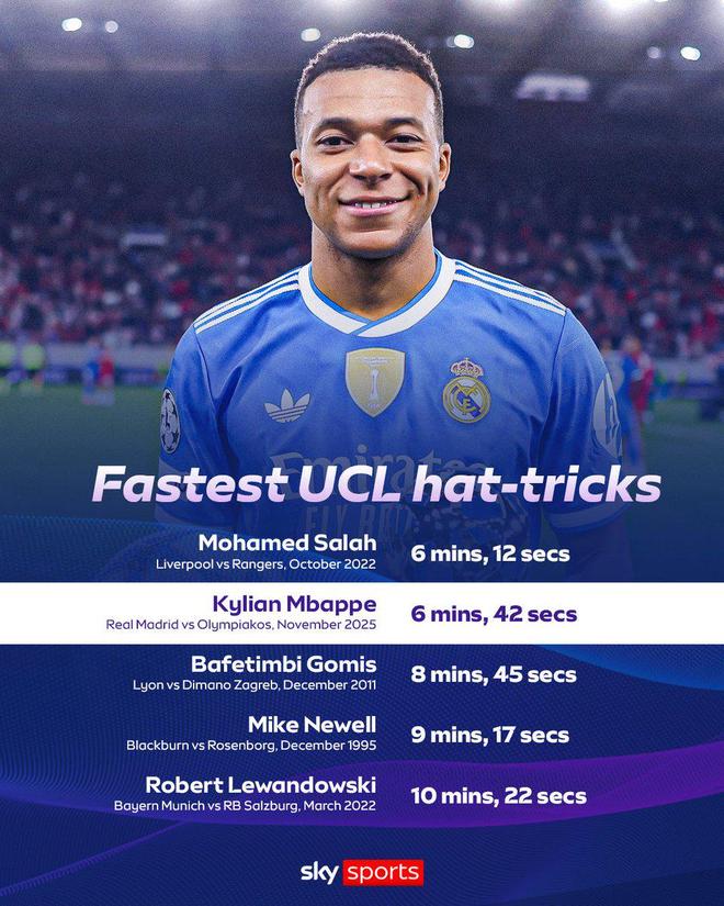 本场比赛,姆巴佩在6分42秒后就打进了三粒进球,根据统计,这是欧冠历史上第二快的帽子戏法,仅次于萨拉赫。