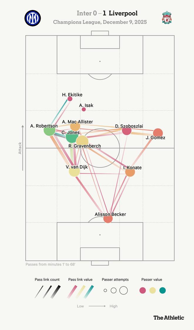 斯洛特弃用萨拉赫的决定导致了“安全第一”的战术思路,这影响了球队的进攻威胁。这也限制了两名中锋可能产生的影响力,他们之间几乎没有什么联系(如下方的传球矩阵图所示),但在欧洲赛场一场艰难的客场之旅中,这从来都不是易事。