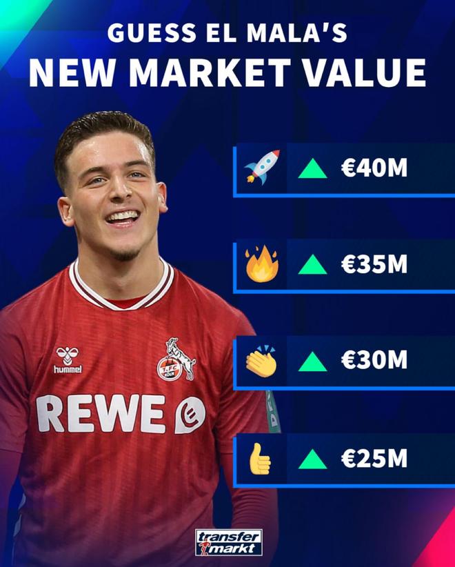 德转即将对德甲球员的身价进行更新。今日德转预热科隆新星赛义德-马拉身价上涨,球员最高从1800万欧涨至4000万欧。
