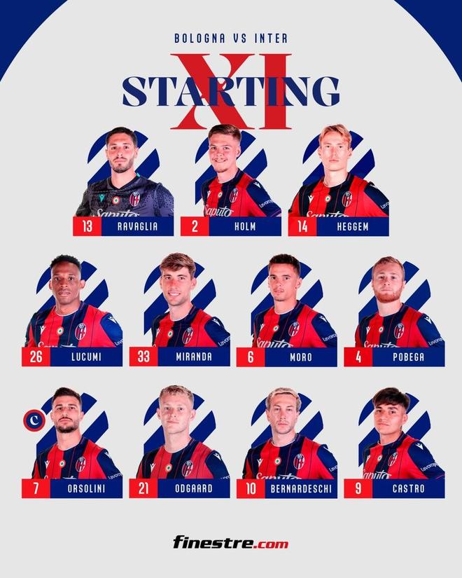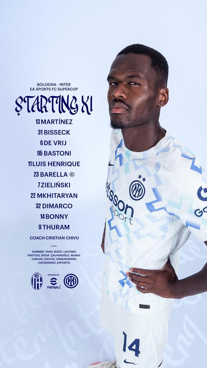 国米首发:13-何塞普-马丁内斯、31-比塞克、6-德弗赖、95-巴斯托尼、11-路易斯-恩里克、23-巴雷拉、7-泽林斯基、22-姆希塔良、32-迪马尔科、14-博尼、9-图拉姆