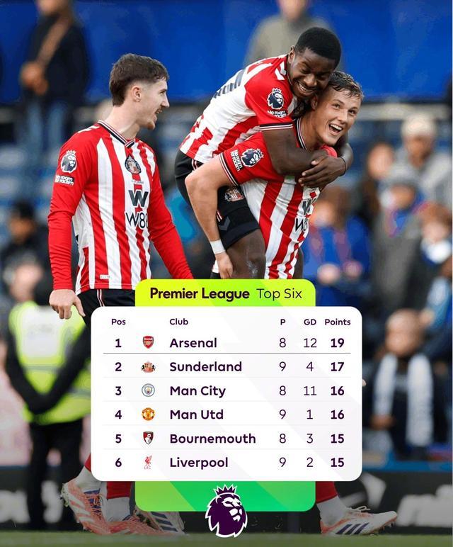 来看最新出炉的英超前六球队,这绝对是不少球迷未曾设想的排名:阿森纳、桑德兰、曼城、曼联、伯恩茅斯、利物浦!