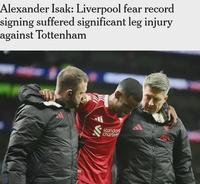TA记者DO消息,利物浦担心伊萨克在对热刺的比赛中抢射进球时遭遇了重伤,目前的担忧是,伤病和瑞典前锋的左腿有关,红军会在核磁共振检查结果出来后尽快确定伤情。