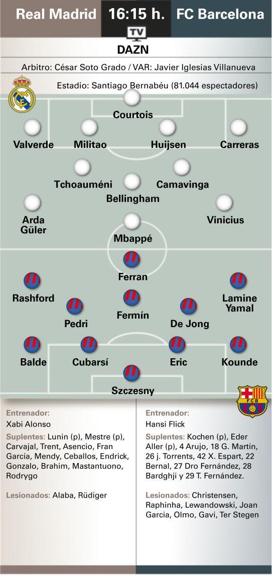 雷速体育10月26日讯 北京时间今晚23点15分,西甲国家德比将在伯纳乌上演。皇家马德里主场迎战巴塞罗那,这不仅是赛季首回合“国家德比”,更是一场争夺榜首的直接对话——如果取胜,巴萨将反超皇马登顶积分榜。赛前,《世界体育报》对两队首发进行了预测。