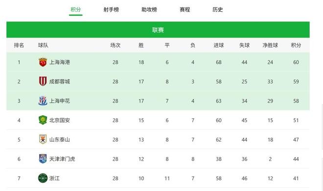 10月26日,中超第28轮继续上演精彩的争冠大战。在上海海港队率先以1比3输给球风强悍的山东泰山队后,原本排名第二的成都蓉城、上海申花竟然也没有全取三分,直接导致海港队即便输球依旧是积分榜领头羊。