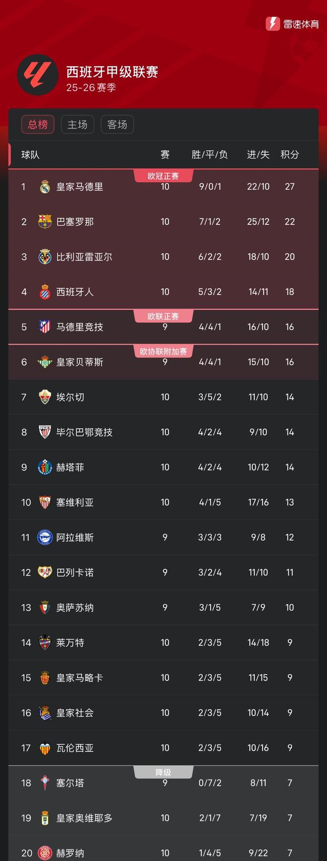 西甲最新积分榜(截至10月27日凌晨)