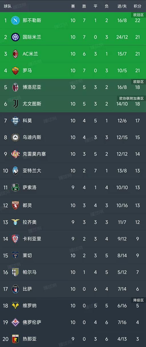 北京时间11月3日,意甲第10轮结束了8场比赛,最新积分榜如下!