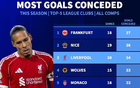本赛季五大联赛失球榜:法兰克福37球居首,利物浦34球排第3